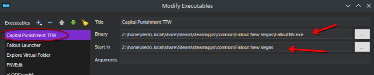 Ensure that the executable paths for the "Capital Punishment"" entry to match the following. If you are on a general Linux system, adjust the paths as necessary to your Steam Library location.