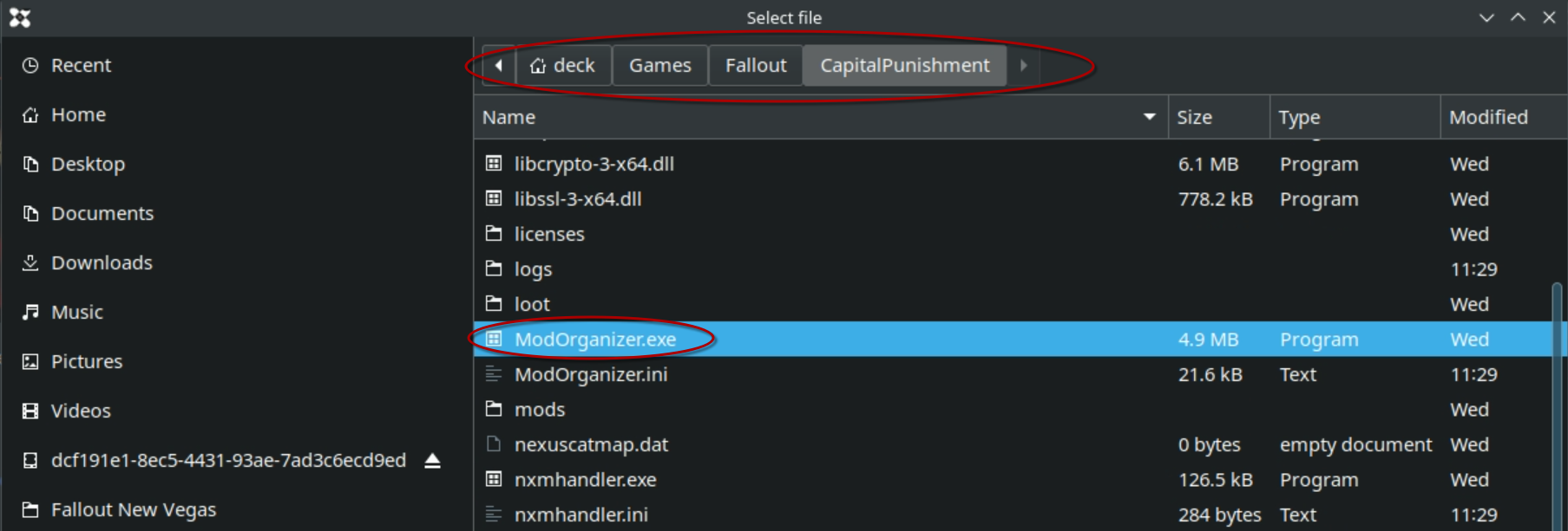Copy the Modlist directory into this newly created directory. There are many ways to do this. I chose to enable ssh on my Deck, and then use rsync to transfer. There are too many options to discuss here, but it should be relatively easy to search for methods. I copied the Modlist Install directory contents to the newly created directory on the Deck: /home/deck/Games/Fallout/CapitalPunishment/
