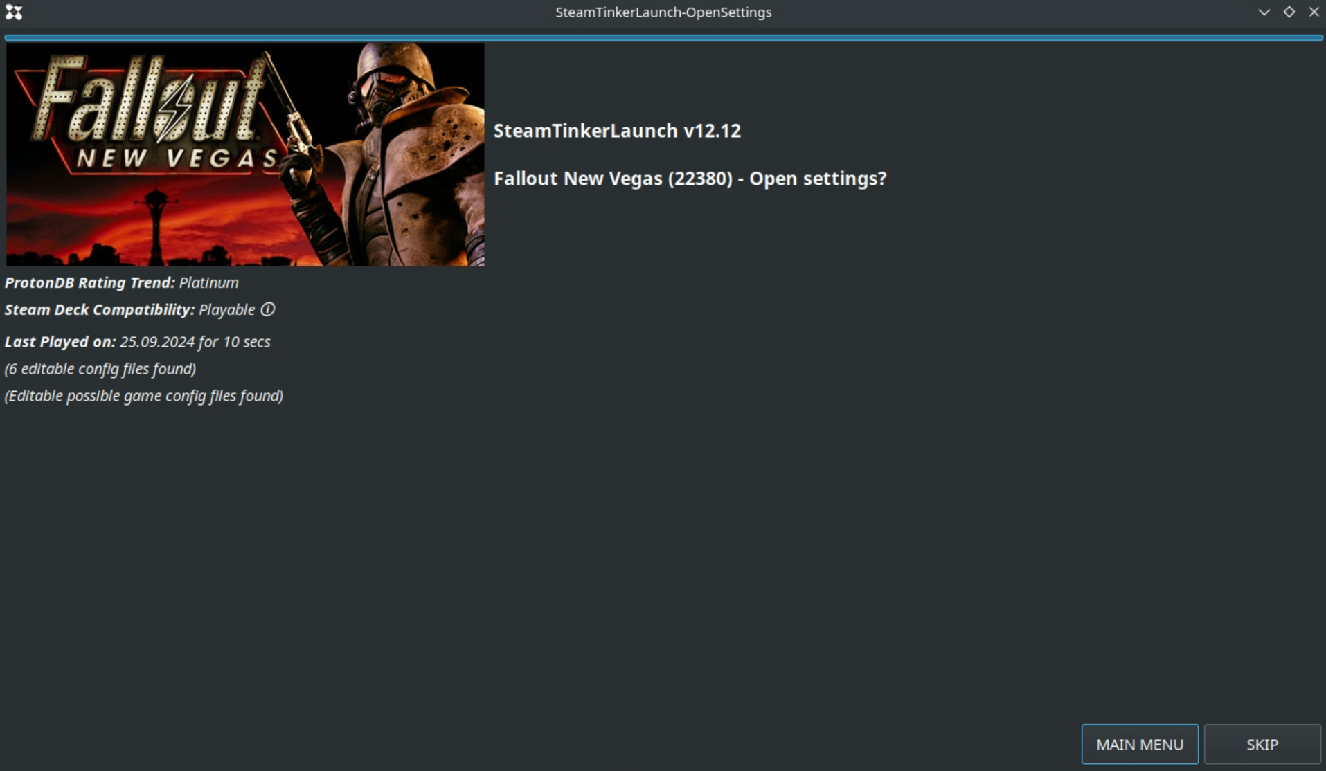 Close the properties window and launch the game from steam. However, instead of loading Fallout: New Vegas, this will load a SteamTinkerLaunch window, and you'll have to quickly click on "Main Menu" down the bottom: