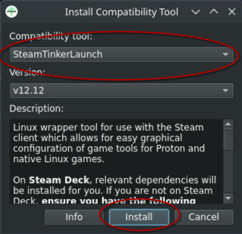 In the "Compatibility tool" drop down, select steamtinkerlaunch if you are on Steam Deck, or steamtinkerlaunch-git if you are on a general Linux system, and then click Install:
